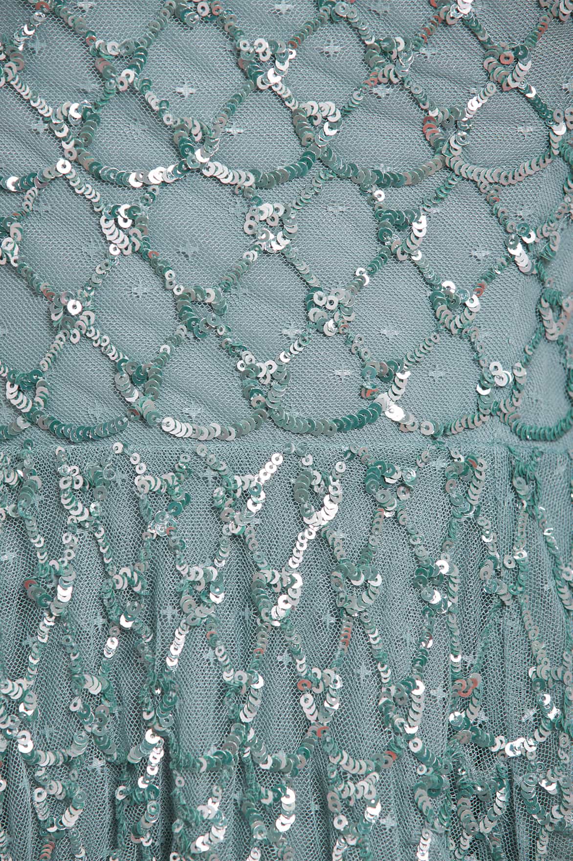 NEW SEASON | NEEDLE & THREAD EXCLUSIVE. The Heart Lattice Micro Mini Dress in Thistle Blue. This dress is decorated with intricate embellishment made using the smallest sequins for exquisite detailing. Beautifully designed with heart-shaped motifs in a lattice layout. This dress features a cape for romantic detailing and a statement look. Make an entrance at your next event.