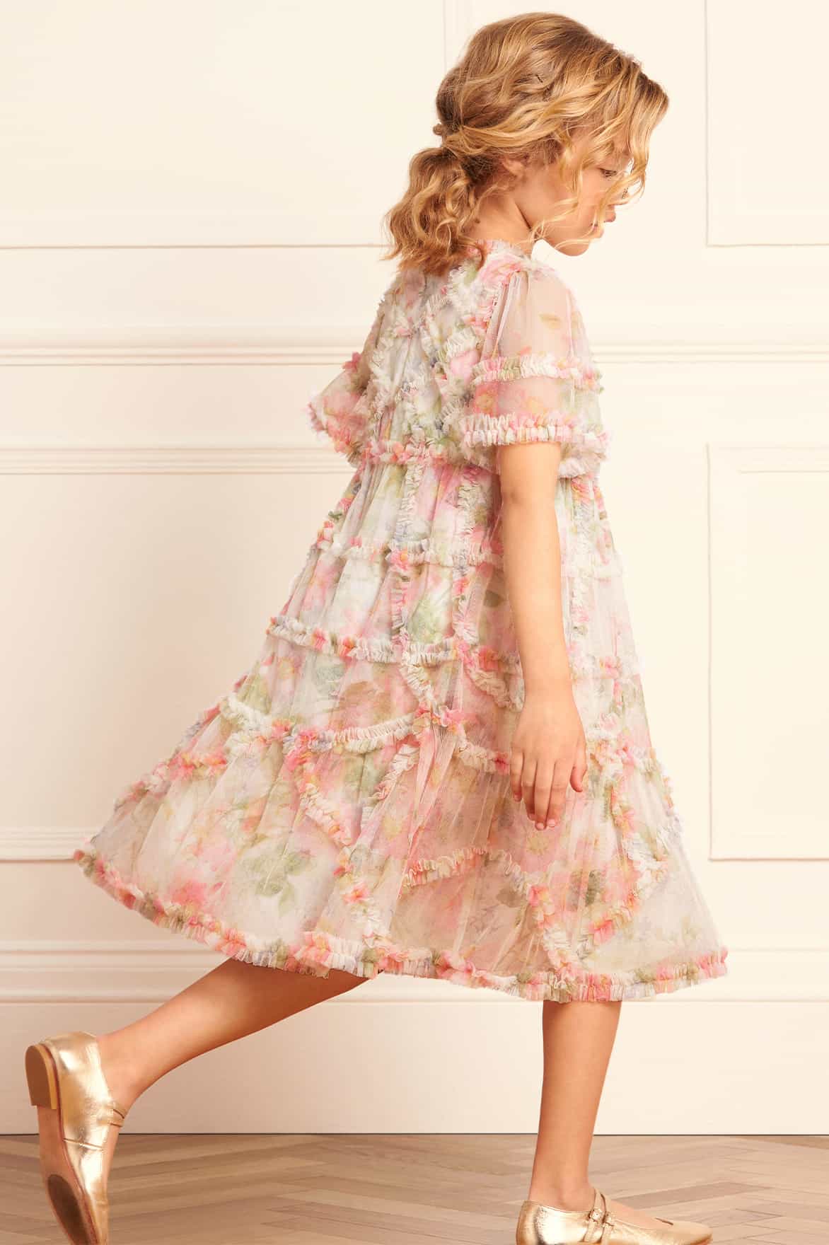 NEW SEASON. The Immortal Rose Maeve KIDS Dress in Moonshine. This dress is designed with a beautiful print, inspired from an antique early 1900's hand-painted artwork. Designed with the prettiest wild rose motifs in soft pastel pink, intertwined with vibrant green foliage. Developed with signature Needle & Thread textile tulle and delicate, gathered frills perfectly placed to add frothy texture throughout. The perfect wardrobe staple for your little one.