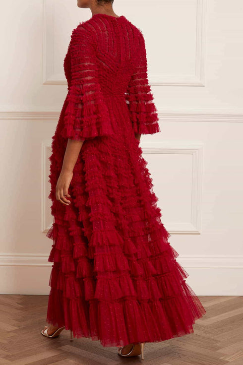 The La Vie En Rose Round Neck Gown in Deep Red. This gown is adorned with delicate tulle ruffles, engineered throughout the panels to enhance the silhouette. Developed with gathered ruffles throughout for a romantic texture. Make a statement in the La Vie En Rose.