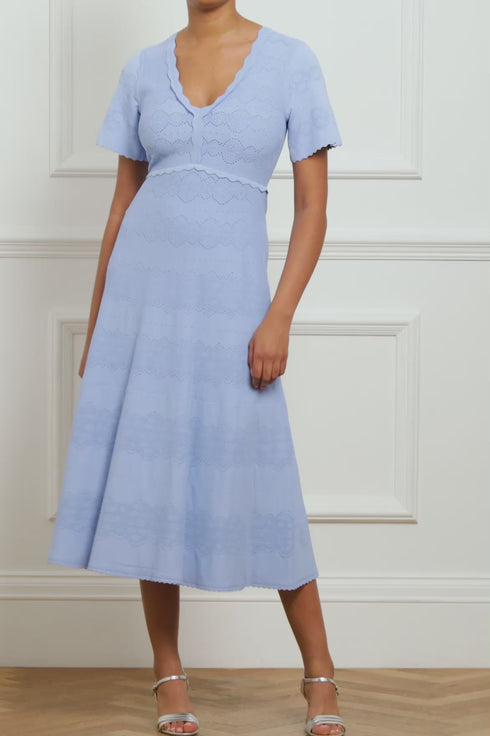 NEW SEASON. The Lace Knit Gown in Iris Blue. This knitted gown is developed from recycled viscose blend, with stretch yarn for a beautiful, flattering texture. Decorated with stitch pointelle details inspired by vintage woven lace ribbons. Crafted with a fitted stretch bodice, a feminine V-neckline and scalloped trim details for a romantic look. This easy-to-wear piece is the perfect wardrobe staple.