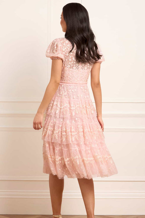 The Layered Lace Midaxi Dress in Dusk Pink/Cream. This Needle & Thread heritage style features exquisite vintage lace-inspired embroidery with floral motifs and trailing leaf and ribbon designs. The flattering wrap front bodice is accented with signature tulle ruffles, while the puff sleeves with elasticated cuffs add a delicate touch. A tiered skirt, crafted from layers of soft tulle, completes the design, offering a romantic and elegant silhouette.