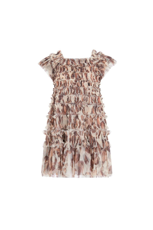 The Leopard Lisette Kids Dress in Moonshine. This statement print was hand-painted in-house using watercolour. Featuring soft leopard motifs that vary in scale with a watery definition. Crafted with a playful, frothy texture created using soft tulle panels gathered to create an all-over pretty effect. Designed with short sleeves and underlayers of tulle to create a generous volume skirt. The perfect dress for your little one's upcoming occasions.