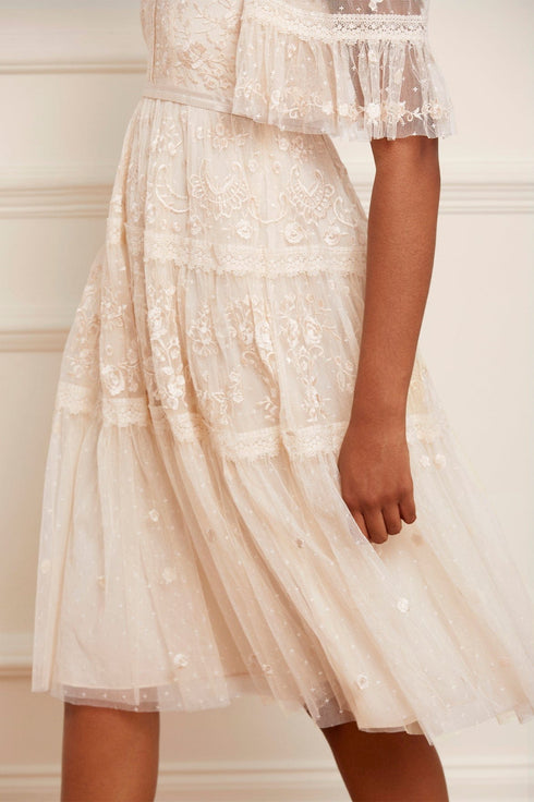 The Lottie Lace Midi Dress in Champagne. A signature Needle & Thread style, updated for the new season ahead. Taking inspiration from Victorian lace, the Lottie features intricately embroidered artwork in a tonal thread featured on delicate tulle. Lace trims border the neckline and frame each tier of the skirt. This embroidered lace dress has sheer, romantic sleeves and our signature grosgrain ribbon at the waist. The perfect dress to take you from day to night.