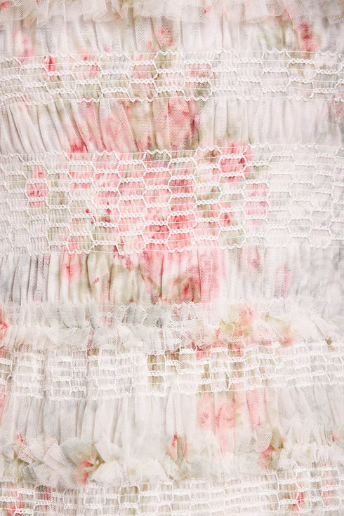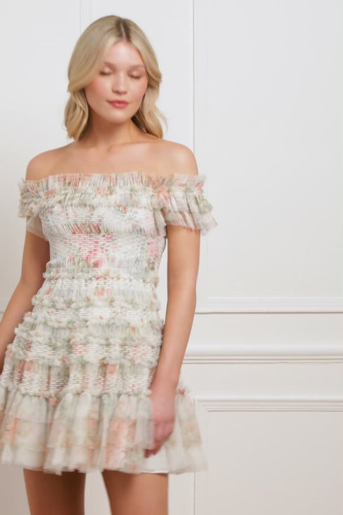 NEW SEASON: The Madame Rose Elodie Off-Shoulder Micro Mini Dress in Moonshine. This opulent dress features an archive-inspired rose print, with an off-shoulder neckline framed by layers of gathered ruffles, creating a soft, romantic effect. The intricate linear smocking design, complemented by signature Needle & Thread tulle frills, gracefully graduates towards the sweeping hem, sculpting a flattering silhouette. Crafted from delicate layers of net and tulle, the skirt flows effortlessly with every movement. An internal stretch power-mesh corset ensures exceptional comfort and shape, while soft boning, encased in grosgrain ribbon, offers refined couture detailing. Elastic trim and adjustable hook-and-eye fastenings provide a customizable, perfect fit.