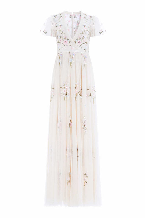 The Petunia Cap Sleeve Gown in Cream. Inspired by Edwardian vintage artwork, this elegant gown is designed with rich embroidered bouquets of delicate florals in soft, pastel shades and subtle, vibrant green highlights. Shimmering iridescent sequins scattered throughout add a glistening effect to the piece. Intricately cut with fine, delicate tulle ruffles trimming the neckline and a voluminous skirt that features a net under layer to hold the shape and create a romantic silhouette. The ultimate fairytale style.