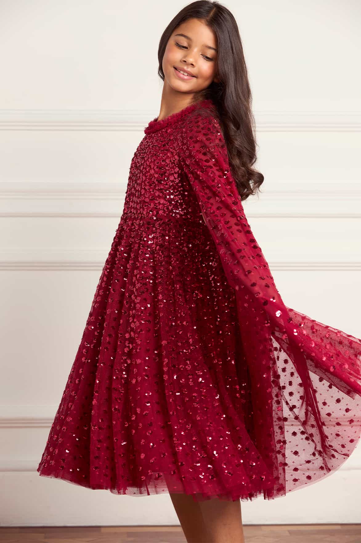 NEW SEASON. The Raindrop Cape Kids Dress in Red. Embroidered with sequins that scatter like falling stars, the gown features cape sleeves for dramatic effect and a flowing skirt for playful twirling. The red tone adds festive vibrancy, making it ideal for party season and celebrations. Pair with the Raindrop Cape Ankle Gown in Red from the adult collection for a coordinated look.