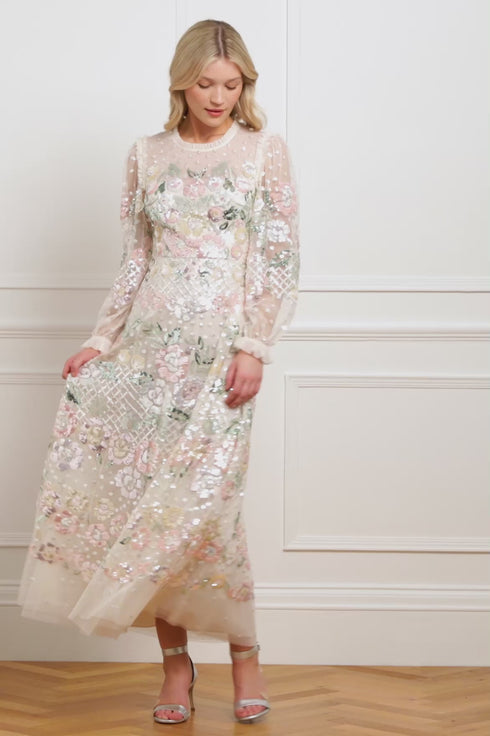 The Rosalie Ankle Gown in Cream. This exquisite piece from Needle & Thread’s heritage collection is a masterclass in timeless elegance. The statement multicolour design is crafted from countless glittering sequins, artfully arranged in floral motifs within linear bands, accented with delicate dotted sequin and crosshatch details. Crafted with signature Needle & Thread tulle frills across the neckline and armholes, adding a touch of sophistication, while the blouson sleeves feature softly gathered elastic cuffs with refined frill edges. The skirt, composed of layers of luxurious soft tulle, flows effortlessly, creating a romantic and ethereal silhouette. This gown is the perfect embodiment of artistry, luxury, and timeless refinement.