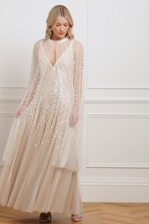 The Sequin Cascade Midaxi Open Cape in Cream. This elegant tulle cape is adorned with shimmering sequin dot motifs that gently scatter toward the hem, creating a soft, luminous effect. Each sequin features a special high-shine foil coating, adding an extra layer of brilliance and depth. Finished with a signature Needle & Thread frill at the neckline and a refined silver metal hook-and-eye fastening, this cape is a timeless accessory designed to elevate any look with grace and sophistication.