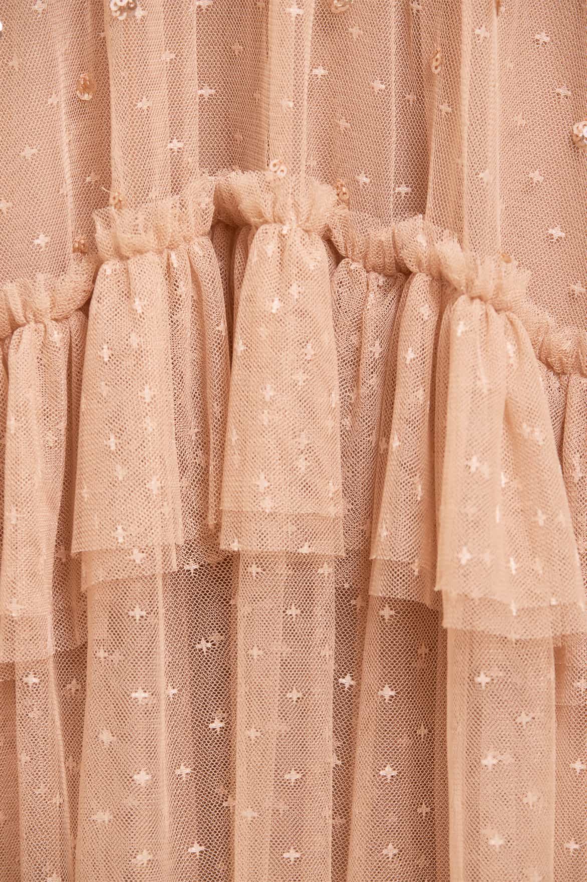 - Kisses tulle decorated with tonal sequins.