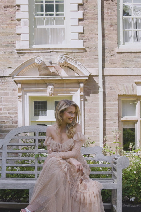 The Sequin Glimmer Rouched Off-Shoulder Gown in Butterscotch. Make an entrance in this showstopping gown, featuring an off-shoulder neckline adorned with cascading circle-cut frills that create a soft, romantic silhouette. Crafted with glittering sequin dot motifs, enhanced with a high-shine foil coating for an ultra-lustrous finish, which gently scatters down the layered tulle skirt, adding ethereal movement. The ruched bodice and sleeves flatter the figure, while the tiered skirt with topstitched gathered frills lends delicate depth and charm. An internal stretch power mesh corset provides structure, comfort, and support, detailed with soft boning encased in grosgrain ribbon and adjustable hook-and-eye fastenings for a refined, couture finish.