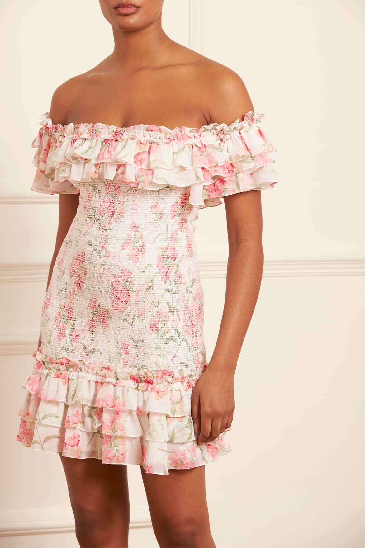 The Summer Posy Chiffon Smocked Micro Mini Dress. Beautifully designed with a perfect summer print taken from a hand-painted artwork from the early 1900s. This mini dress is decorated with pretty posy, floral clusters scattered and dispersed throughout to create an all-over beautiful print. Developed in soft chiffon with a fully stretch elasticated smocking body, adding vintage-inspired detail. Developed with an off-shoulder elasticated design featuring layers of chiffon to create comfort and signature Needle & Thread detailing. The skirt panels are created using layers of chiffon staggered in length to create a playful, frothy silhouette. A piece you'll forever treasure.
