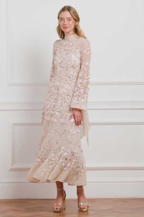 NEW SEASON. The Sylvia Rose Long Sleeve Ankle Gown in Oyster/Multi. Crafted in layers of fine tulle, the gown features long sleeves and a slim, floor-length silhouette and reflects archival florals, through richly embroidered rose motifs scattered with ditsy blooms. The oyster base softens the multi-coloured embroidery, evoking the painterly romance of Victorian design reimagined for today.