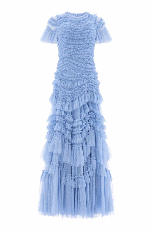 The Wild Rose Short Sleeve Gown in Sky Blue features layers of ruffled tulle and intricate frill tiers, creating a breathtaking, voluminous silhouette. The net tulle skirt adds flattering fullness, making this show-stopping gown perfect for turning heads at any occasion.