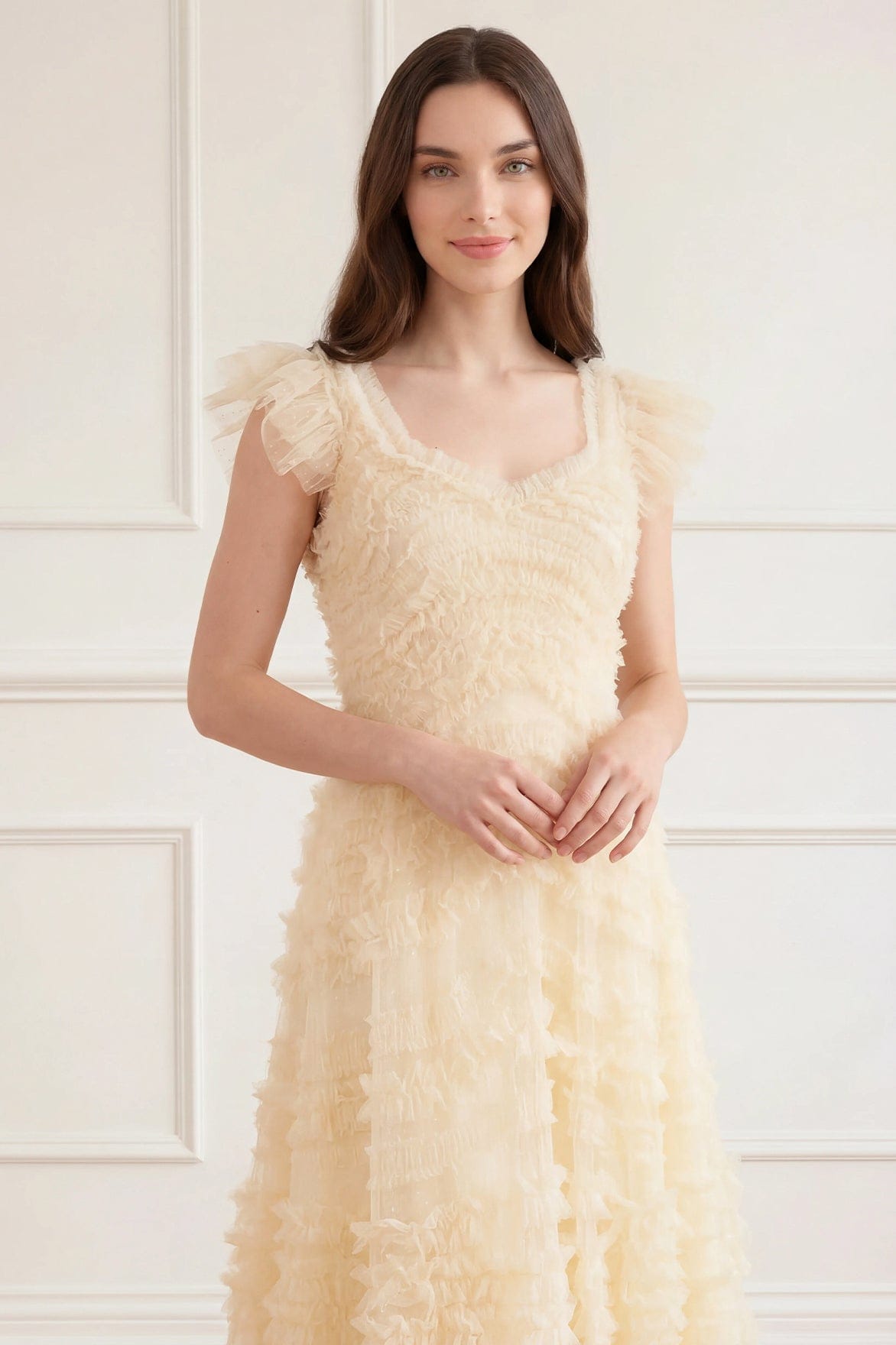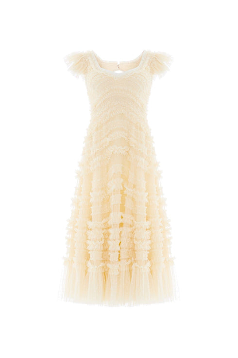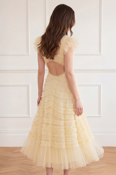 NEW SEASON | NEEDLE & THREAD EXCLUSIVE. The Amara Backless Ballerina Dress in Lemon Sorbet. Inspired by dreamlike English gardens featuring softly curved ruffle bands flowing across the body and into a voluminous ballerina-length skirt. Designed with a statement open back and signature frothy frilled shoulders, this silhouette moves beautifully with every step.