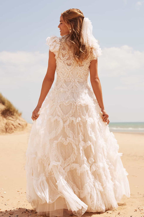 The Amorette V-Neck Gown in Cream. A signature Needle & Thread style; beautifully adorned with our key love heart motif, made from gently gathered delicate tulle. Designed with romantic, frothy sleeves created using layers of delicate tulle and frills for a statement look. Featuring a generously voluminous skirt layered with tulle and net for a full, magical silhouette. A textile piece you'll forever treasure.