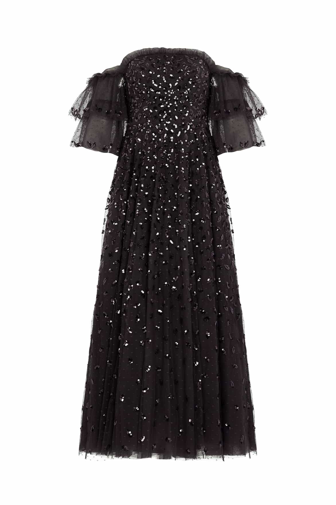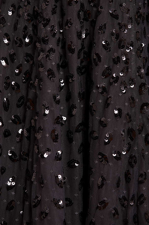 The Autumn Leaves Off-Shoulder Ankle Gown in Graphite. This ethereal piece is adorned with a glittering leaf motif that cascades gently towards the hem, capturing the essence of autumnal elegance. The gown features a romantic off-the-shoulder design complemented by tiered sleeves, each delicately edged with shimmering sequin embellishments. Crafted for comfort and style, the gown includes an internal corset made from stretch power mesh, ensuring a flawless fit while maintaining the garment's structure. The skirt is a true masterpiece, made up of layers of soft, delicate tulle and net, creating a generous and flowing silhouette that’s perfect for any special occasion.