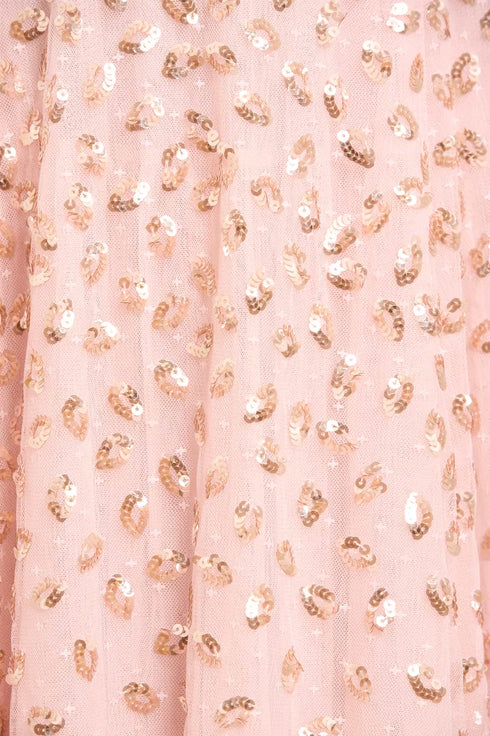The Autumn Leaves Off-Shoulder Ballerina Dress in Dusk Pink/Caramel. This ethereal piece is adorned with a glittering leaf motif that cascades gently towards the hem, capturing the essence of autumnal elegance. The dress features a romantic off-the-shoulder design complemented by tiered sleeves, each delicately edged with shimmering sequin embellishments. Crafted for comfort and style, the dress includes an internal corset made from stretch power mesh, ensuring a flawless fit while maintaining the garment's structure. The skirt is a true masterpiece, made up of layers of soft, delicate tulle and net, creating a generous and flowing silhouette that’s perfect for any special occasion.