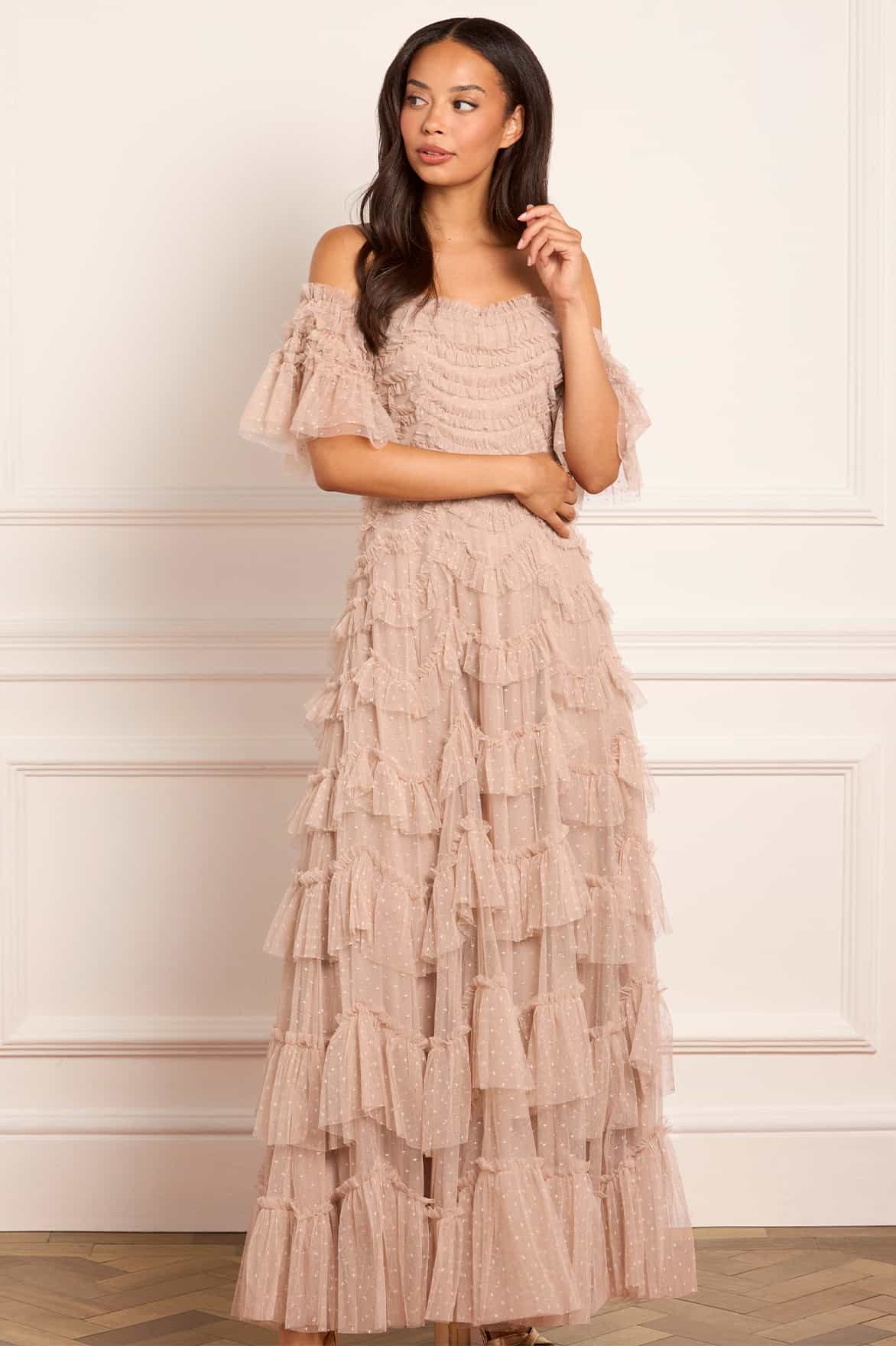 NEW SEASON. The Aviana Off-Shoulder Gown in Sandstone. Drawing from the celestial themes of the Bright Star collection, this gown channels soft romance through rows of delicately topstitched gathered tulle. The scallop frills graduate toward the hem, creating movement and frothy dimension.