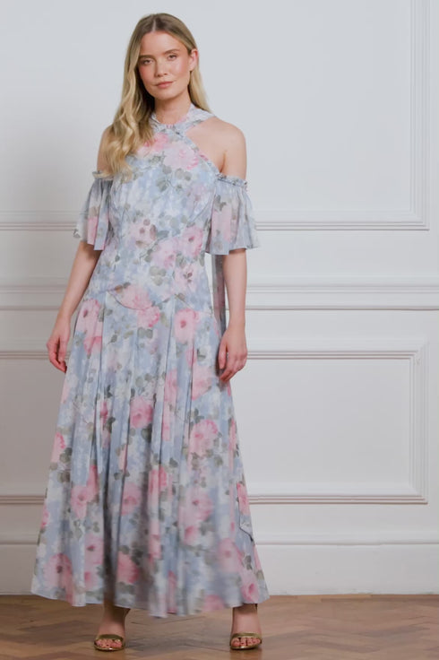 NEW SEASON. The Camille’s Garden Georgette Halter-Neck Gown in Skylight. Showcases the collection’s signature hand-painted floral print. Crafted from airy georgette and finished with a graceful sash tie, this gown is effortlessly elegant and feminine.