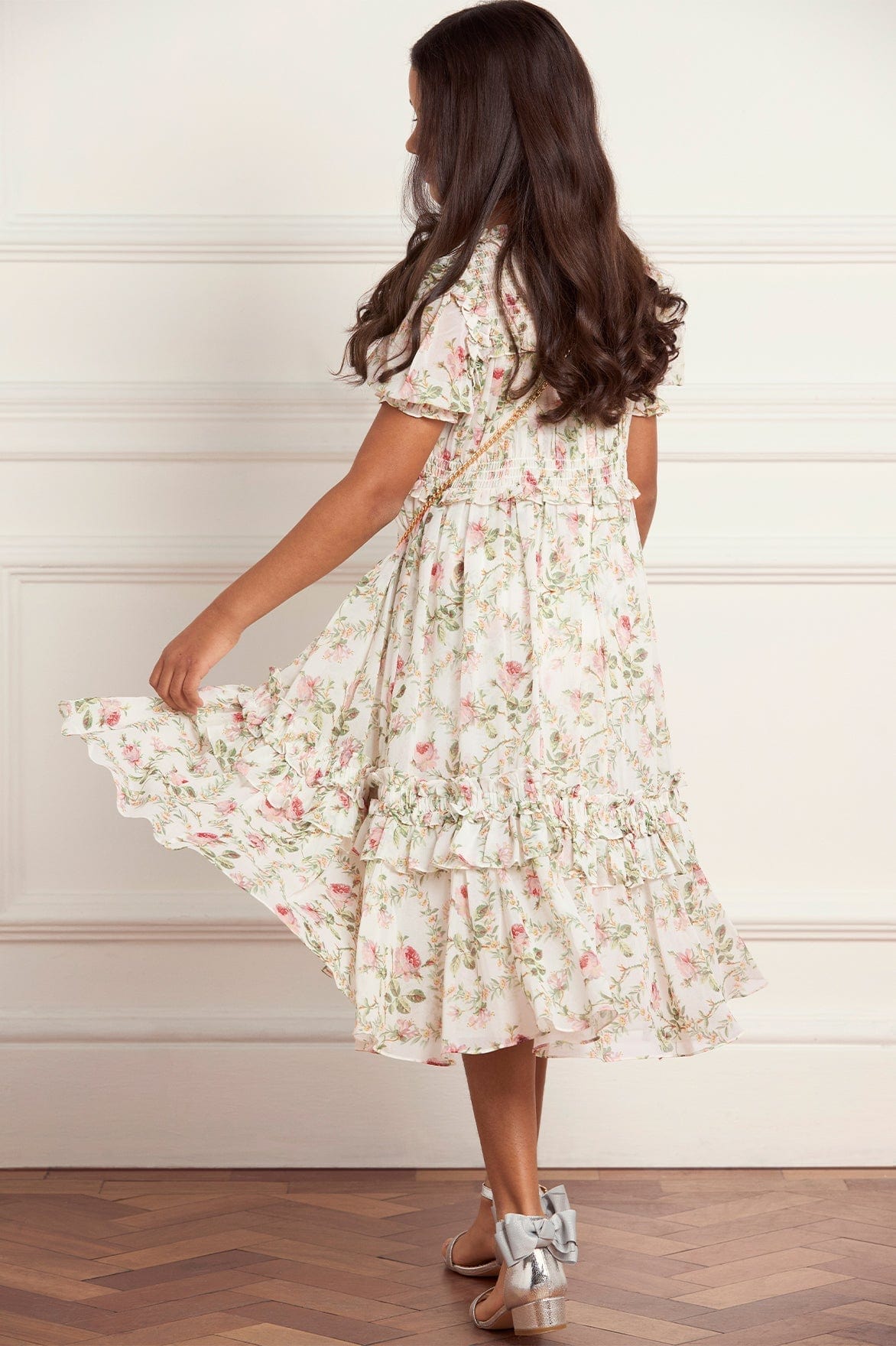 The Colette’s Rose Emilia Georgette Kids Dress in Moonshine. A light and airy dress for little ones. Adorned with our heritage-inspired rose print, the dress features shirred detailing and a gently flared shape. A delightful match to the women's Emilia Georgette styles for truly unforgettable twinning moments.