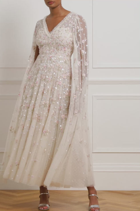 The Dahlia Ditsy Ankle Gown in Cream. This gown is beautifully decorated with shimmering silver sequins in delicate dot motifs and intricate floral embroidery in pastel pink tones. Featuring our new floor-length cape for romantic detailing. Developed with layers of net and tulle for a full and voluminous skirt. The perfect statement style for a special occasion.