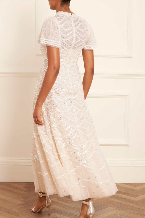 The Deco Dot Gloss Ankle Gown in Cream. This style has an artwork inspired by 1930’s art deco styling. Developed with layered tulle sleeves and a sequin border edge for 1930’s romantic styling. The perfect gown for an upcoming special occasion.