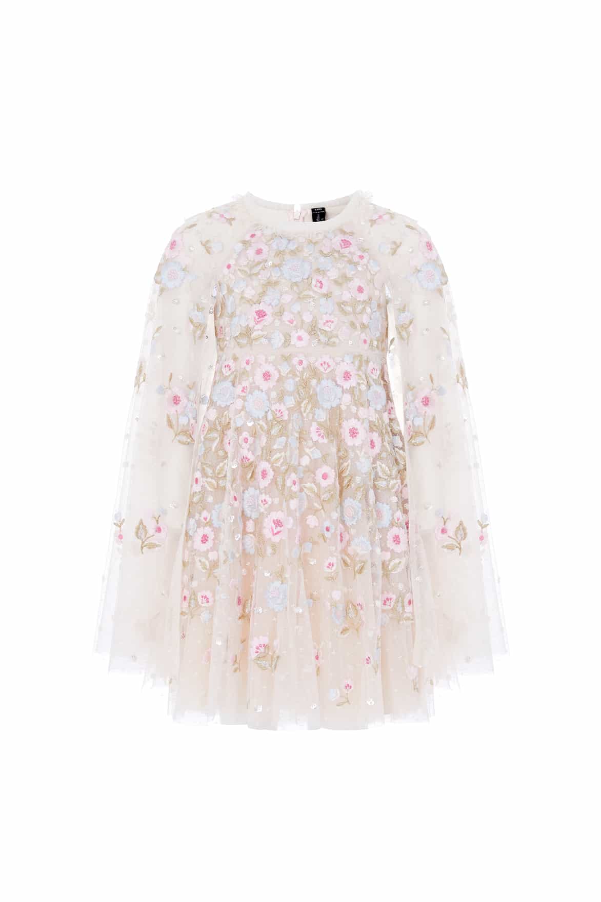 NEW SEASON. The Ethereal Blooms Cape Kids Dress in Cream/Multi. Decorated with beautiful floral embroidery in pastel tones. Featuring a soft cape overlay and a flared skirt, it’s a fairytale piece for little dreamers. This piece mirrors the Ethereal Blooms Cape Sleeve Gown from the womenswear line for a perfectly matching moment.