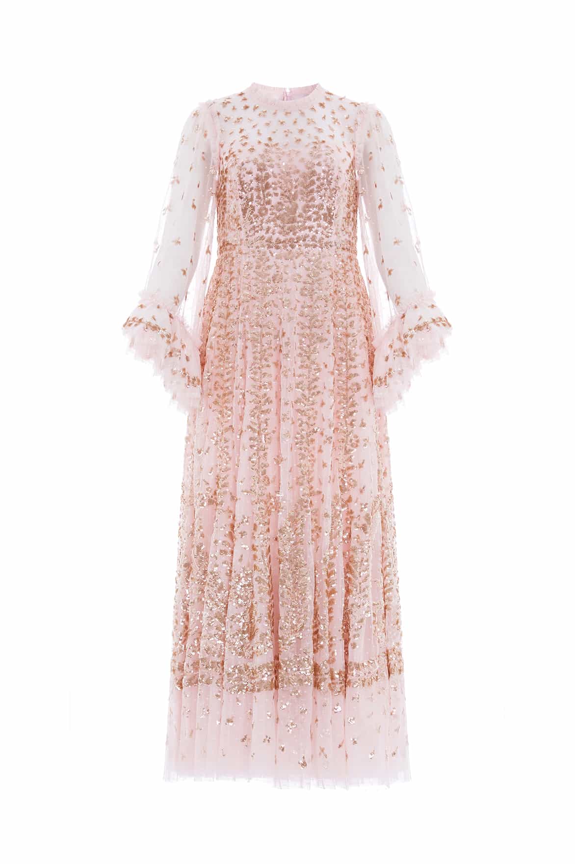 The Fern Ankle Gown in Dusk Pink/Caramel. Inspired by a historical archive artwork, this gown features a shimmering statement sequin border on the skirt hem with a trailing glittering motif design that disperses towards the dress. Crafted in soft tulle with signature Needle & Thread frills, this luxurious style boasts voluminous sleeves with embellished motifs and romantic frills at the cuffs, adorned with glistening sequins. The sequins have a special high-shine gloss finish created by extra foil coating. The skirt is generously made up of layers of soft, delicate tulle and net. A classic and contemporary style.