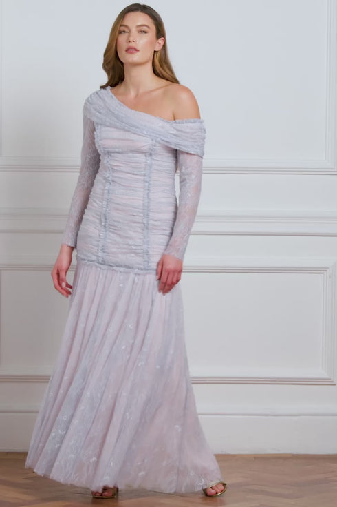 NEW SEASON. The Gigi Lace One-Shoulder Rouched Gown in Skylight/Seashell. A romantic statement crafted from delicate lace. Designed with a ruched bodice and one-shoulder silhouette, this gown combines soft texture and modern elegance in a refined pastel palette.