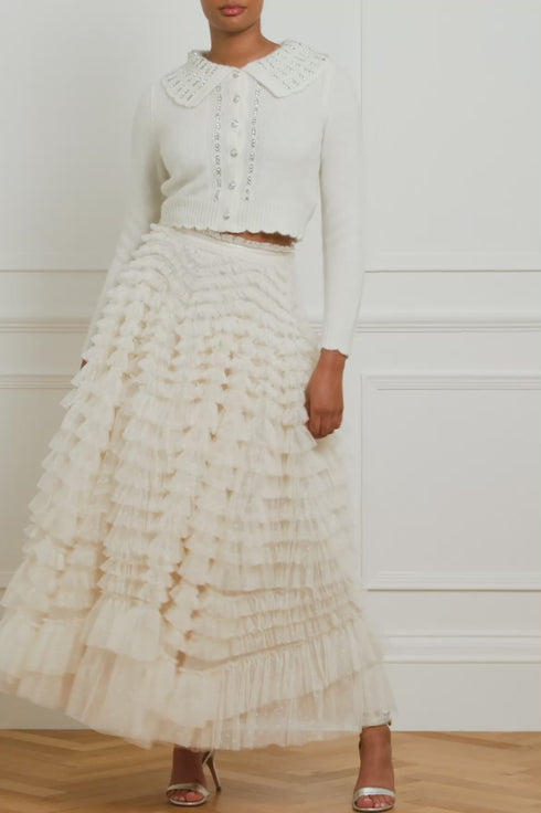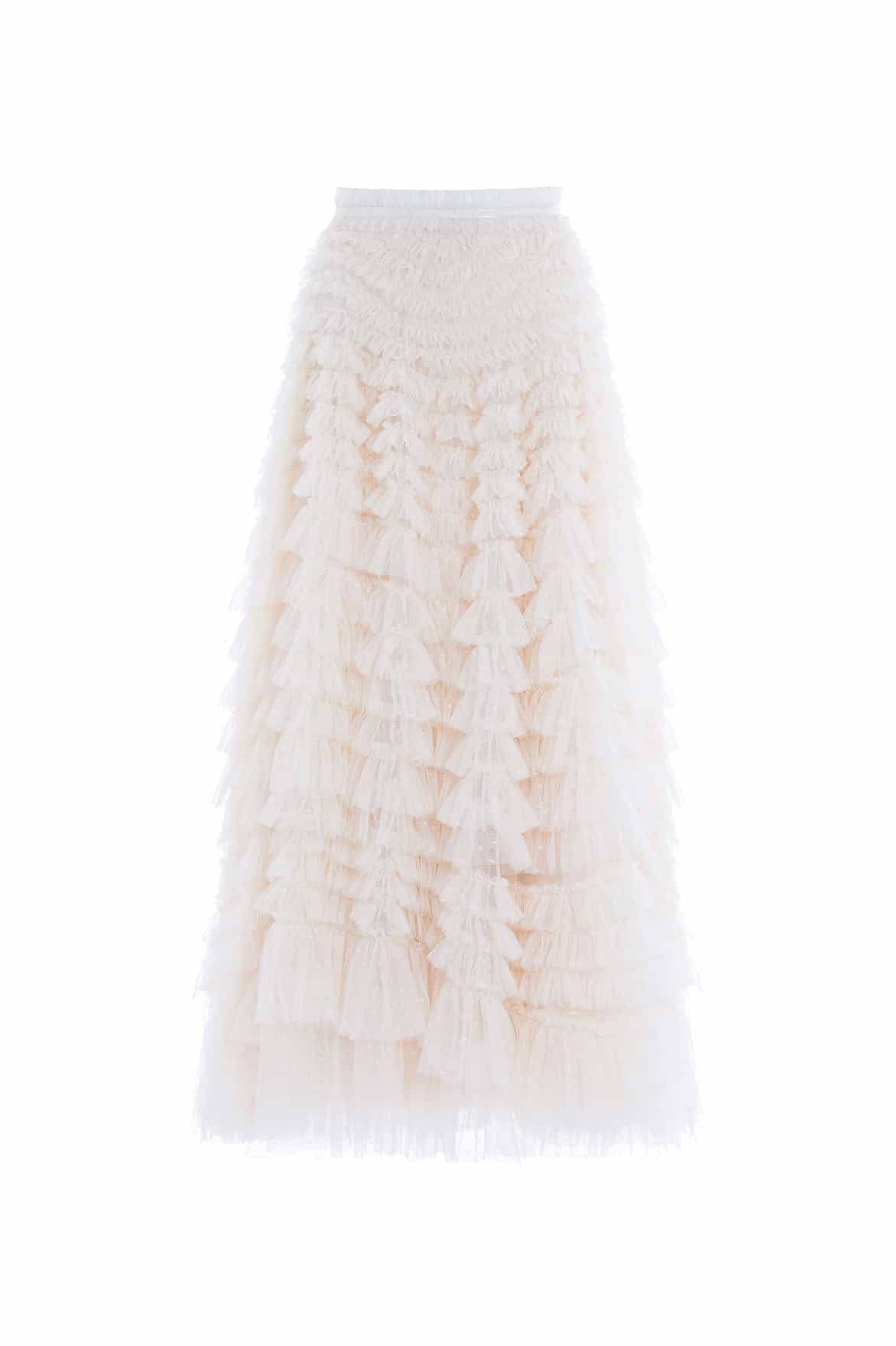 The Hattie Ruffle Skirt in Cream. This textile skirt is engineered with layers of soft tulle and net to create a signature Needle & Thread style. Crafted with individual ruffles to create a beautiful, frilly texture. Designed with a sweeping hemline and finished at the waist with a satin ribbon for extra detail. We recommend pairing this skirt with our knitwear for a romantic Needle & Thread look.