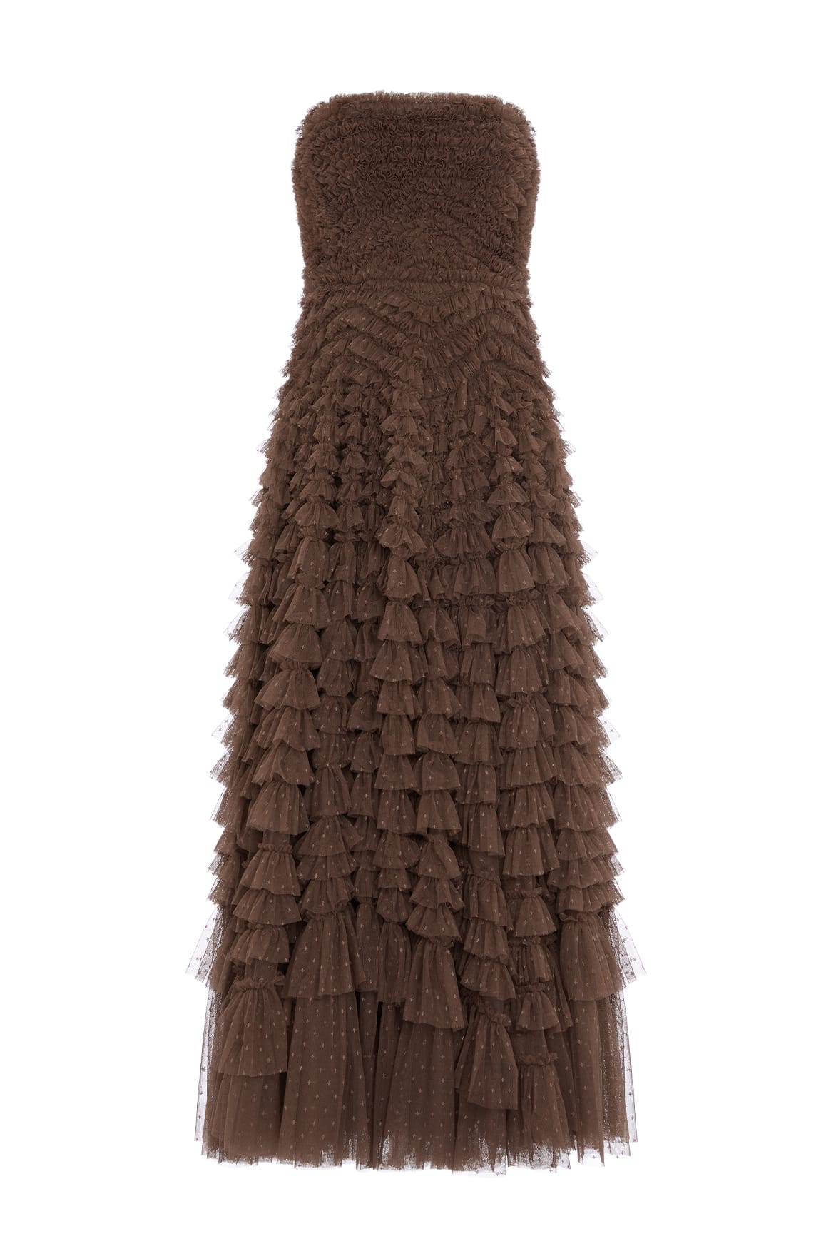 The Hattie Ruffle Strapless Ankle Gown in Chocolate. This gown is elegantly developed with layers of frothy tulle creating a soft, wavy textile. This strapless gown features signature Needle & Thread ruffles and frills for intricate, romantic detailing. Make the ultimate statement in the Hattie at your next event.