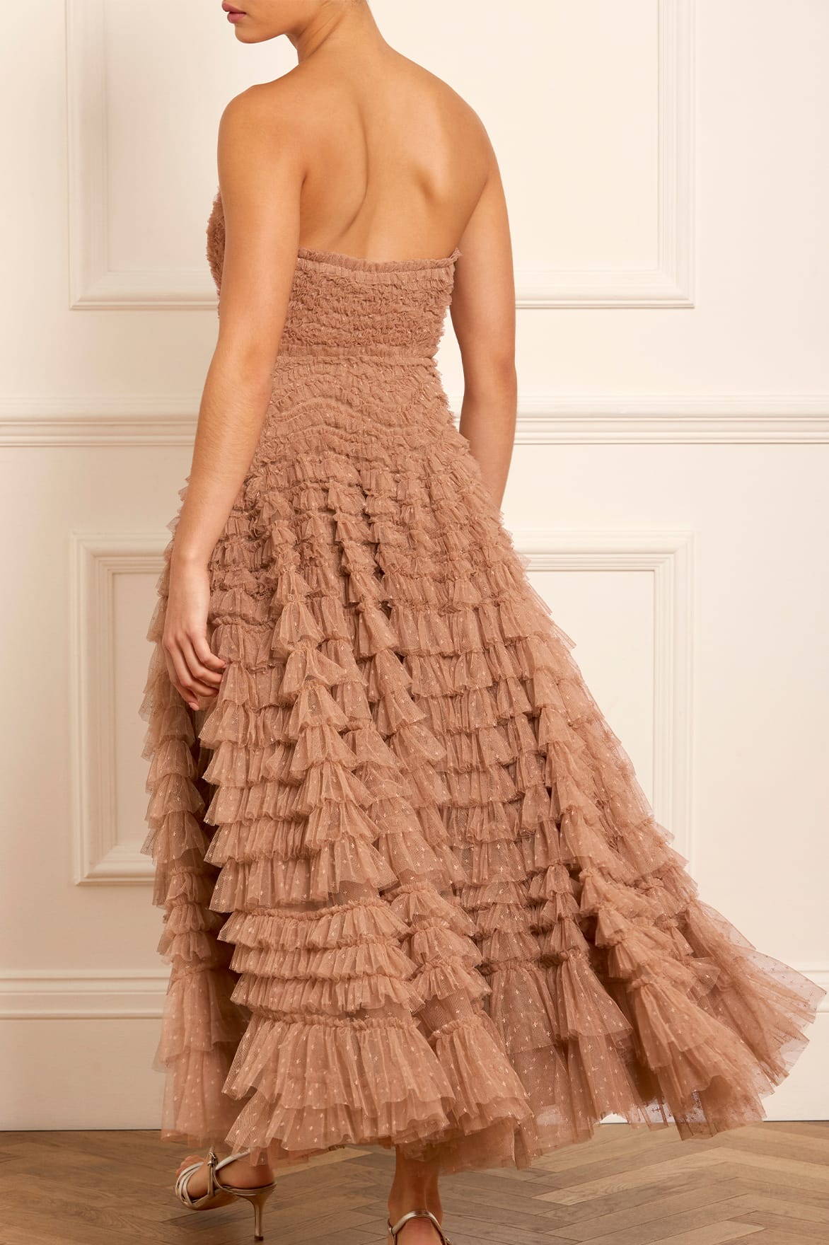 The Hattie Ruffle Strapless Ankle Gown in Mocha. This gown is elegantly developed with layers of frothy tulle creating a soft, wavy textile. This strapless gown features signature Needle & Thread ruffles and frills for intricate, romantic detailing. Make the ultimate statement in the Hattie at your next event.