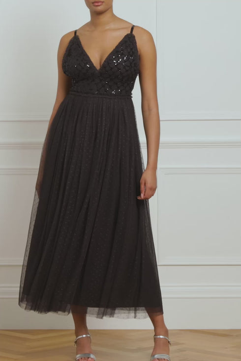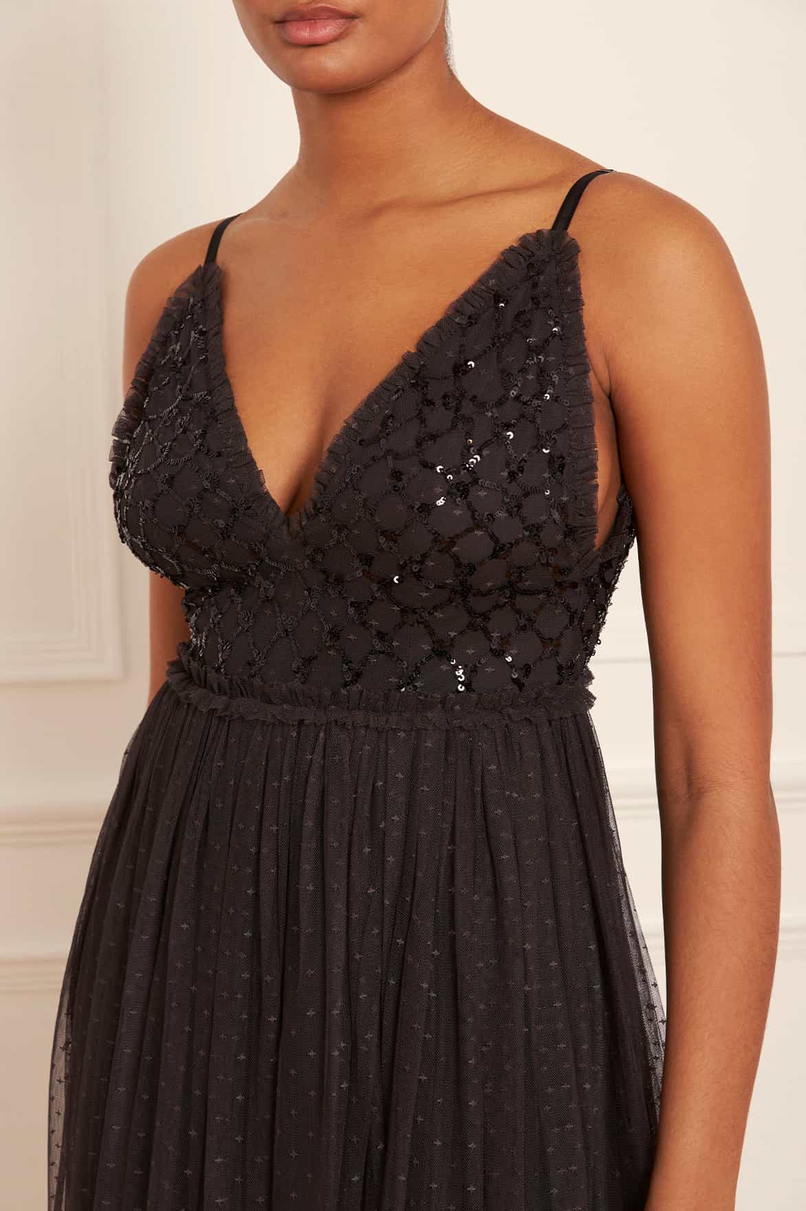 - Form fitted bodice with a plunging neckline and a multi-layered full skirt