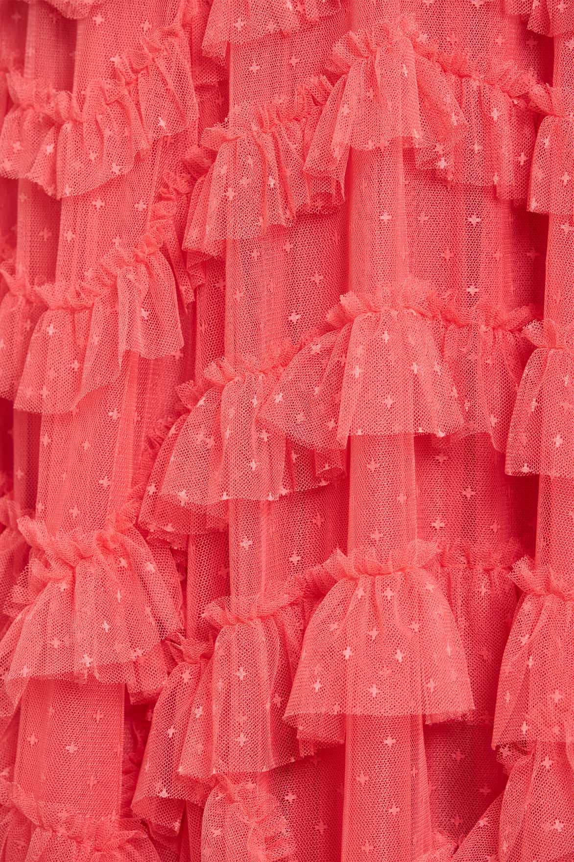 The Lana Round Neck Gown in Pink Sky. This beautiful gown is adorned and engineered with tulle frills to create a romantic textile. Developed with a round neck design and long sleeve for an elegant look. Beautifully crafted with layers of soft tulle for a whimsical, statement texture. Expect all eyes on you in this magical Needle & Thread piece.