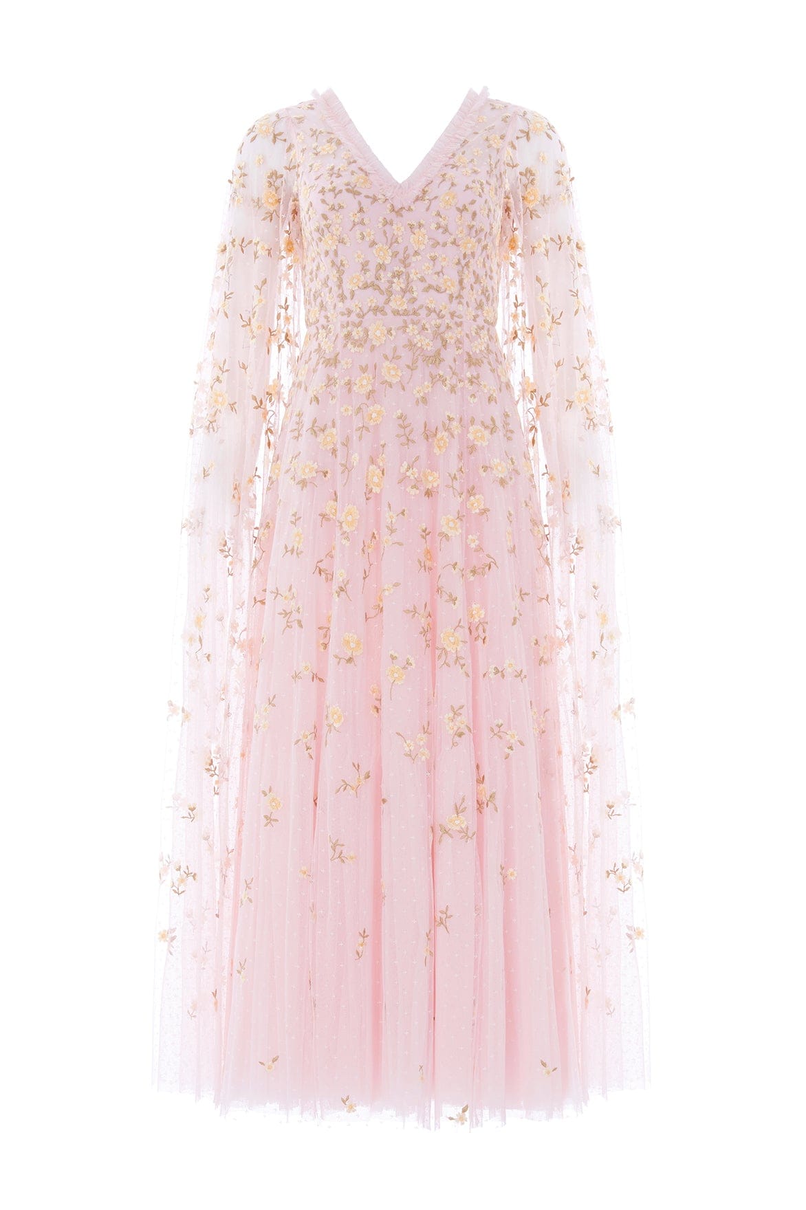 NEW SEASON. The Lea Ditsy Cape Sleeve Ankle Gown in Peony Pink/Lemon Sorbet. Inspired by archival garden artwork, this gown features romantic ditsy florals with trailing leaves across the silhouette. Finished with soft cape sleeves and a flowing ankle-length skirt for graceful, feminine movement.