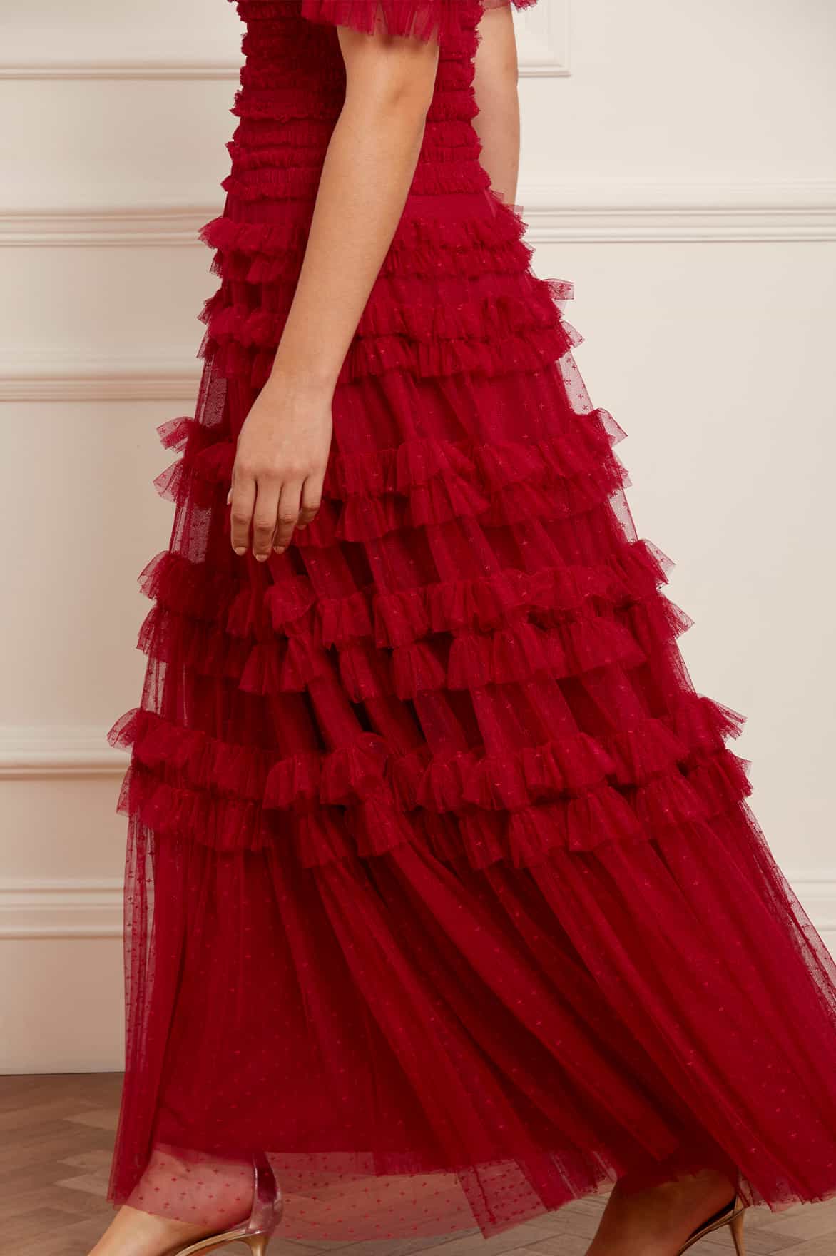 The Lisette Ruffle Off Shoulder Gown in Deep Red. This statement gown has an elegant off-the-shoulder design inspired by Hollywood styling. Crafted with textile tulle and double-stitched frills for a dramatic, romantic effect. Features an integrated corset for a perfect fit and to hold the silhouette. Expect all eyes on you in this romantic gown.