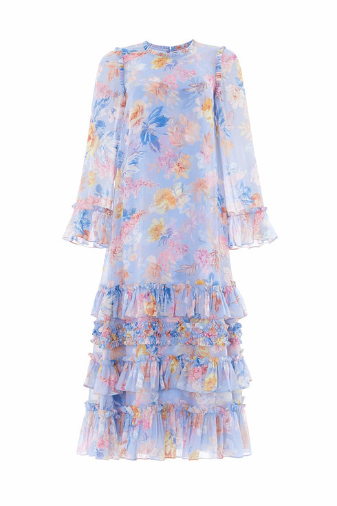 The Mariannes Floral Chiffon Round Neck Ankle Gown in Sky Blue, inspired by Victorian botanical artist Marianne North. Featuring a vibrant vintage floral print with bold brushstrokes, this soft chiffon gown offers a romantic, floaty silhouette. The semi-sheer fabric includes a separate slip for added modesty, while layered frills at the hem highlight Needle & Thread's signature style, blending elegance with relaxed charm. The ideal piece to effortlessly transition from day to night.