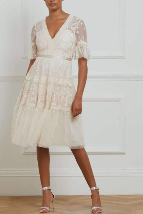 Midsummer Lace Dress in Champagne/Ballet Slipper. A signature Needle and Thread style, updated for the new season ahead. Taking inspiration from Victorian lace, the Midsummer features intricately embroidered artwork in romantic colours on delicate tulle. Lace trims border the neckline and frame each tier of the skirt. This embroidered lace dress has sheer, romantic sleeves and our signature grosgrain ribbon at the waist. The perfect dress to take you from day to night.