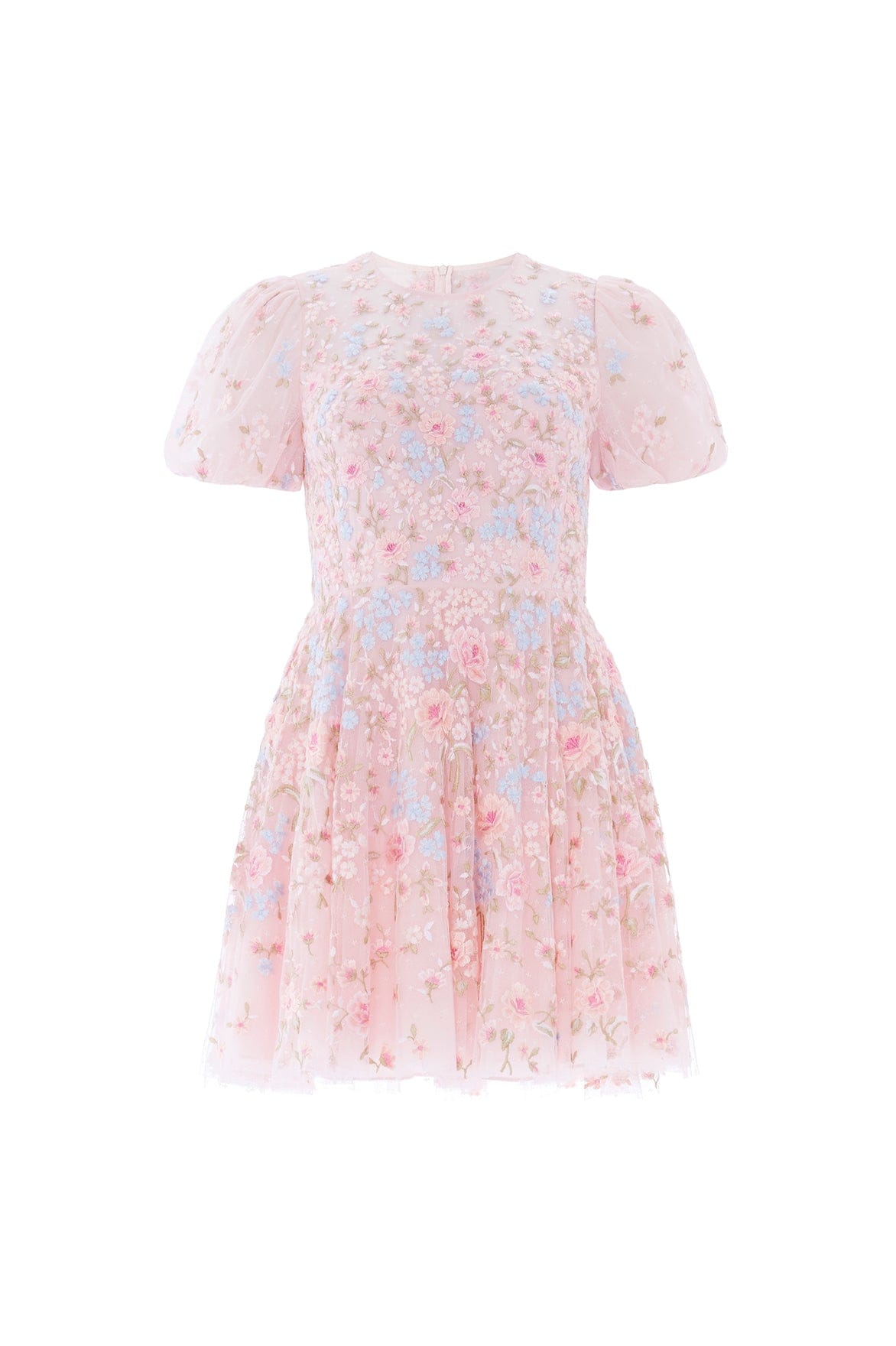 NEW SEASON. The Peony Bouquet Round Neck Micro Mini Dress in Peony Pink/Multi. A playful micro mini silhouette adorned with exquisite floral embroidery inspired by painted garden florals. Designed for statement dressing, this style balances romance with modern femininity.