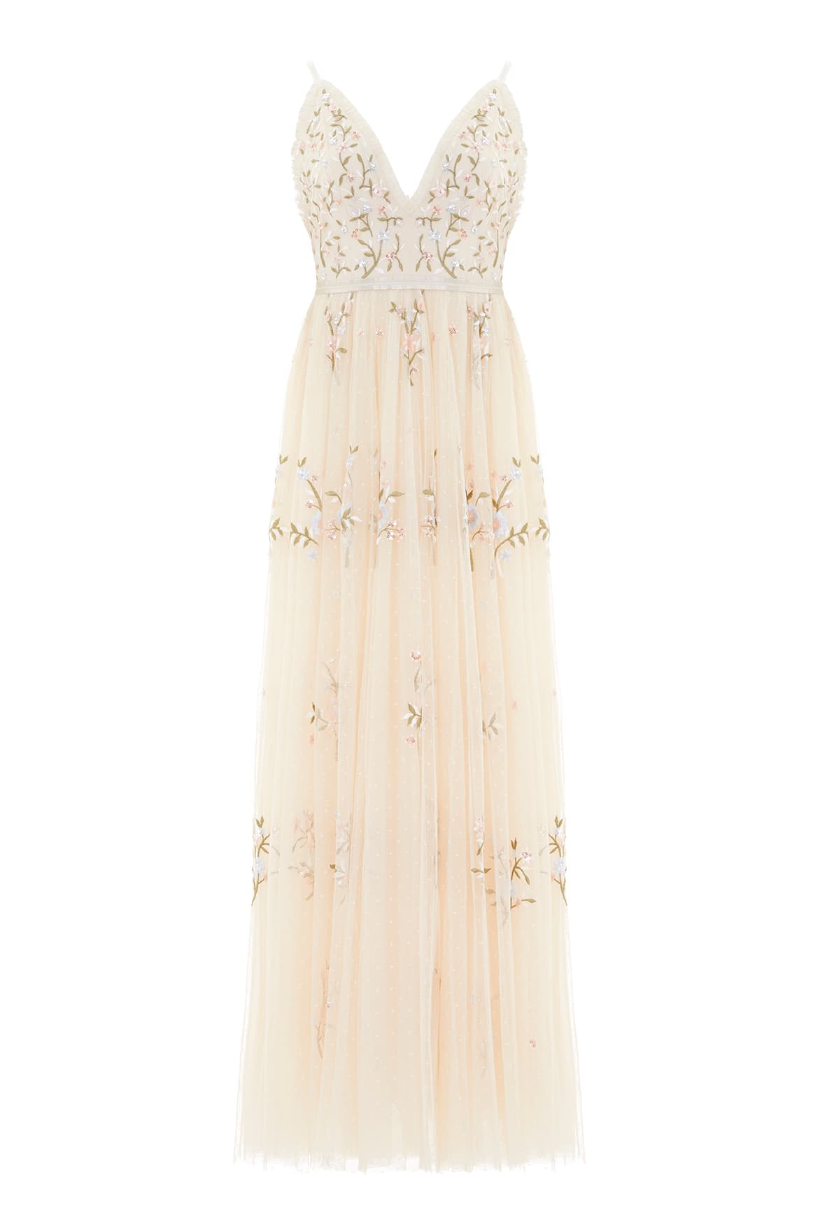 The Petunia Gown in Champagne. Inspired by Edwardian vintage artwork, this elegant gown is made up of scattered, richly embroidered bouquets of delicate florals in soft, pastel shades and subtle, vibrant green highlights. Shimmering iridescent sequins scattered throughout add a glistening effect to the piece. Intricately cut with fine, delicate tulle ruffles trimming the neckline, and a voluminous skirt that features a net under layer to subtly hold the shape, creating a truly romantic silhouette. Pair with the Petunia Cape for a statement look.