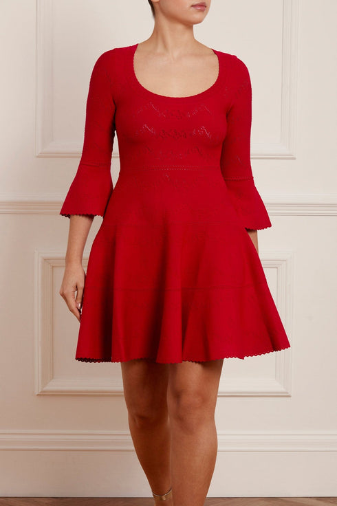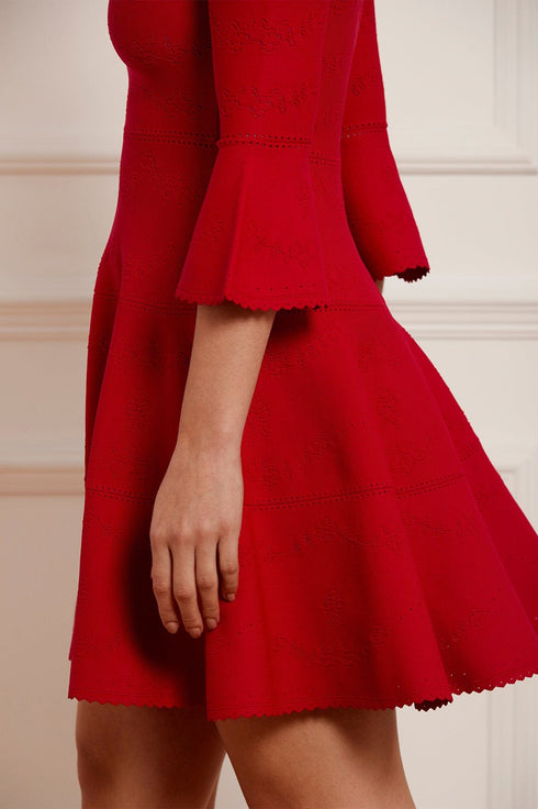 The Pretty Pointelle Knit Scoop Neck Mini Dress in Red. A brand new style for Needle & Thread. This knitted dress is inspired by vintage ditsy florals and lace. Beautifully designed with all-over pretty pointelle stitch, delicate florals and scallop details. This dress has a fitted stretch bodice with a soft, feminine neckline, fluted cuffs and signature Needle & Thread detailing. A truly flattering piece.