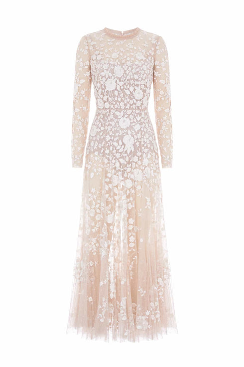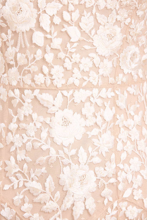 The Rosa Sheer Ankle Gown in Beige/Cream. An ethereal piece with luxurious contrast rose embroidery. Featuring a sheer outer layer and an integrated powermesh bodysuit for coverage, this style blends vintage artistry with a modern silhouette. Make a statement in this showstopping style.