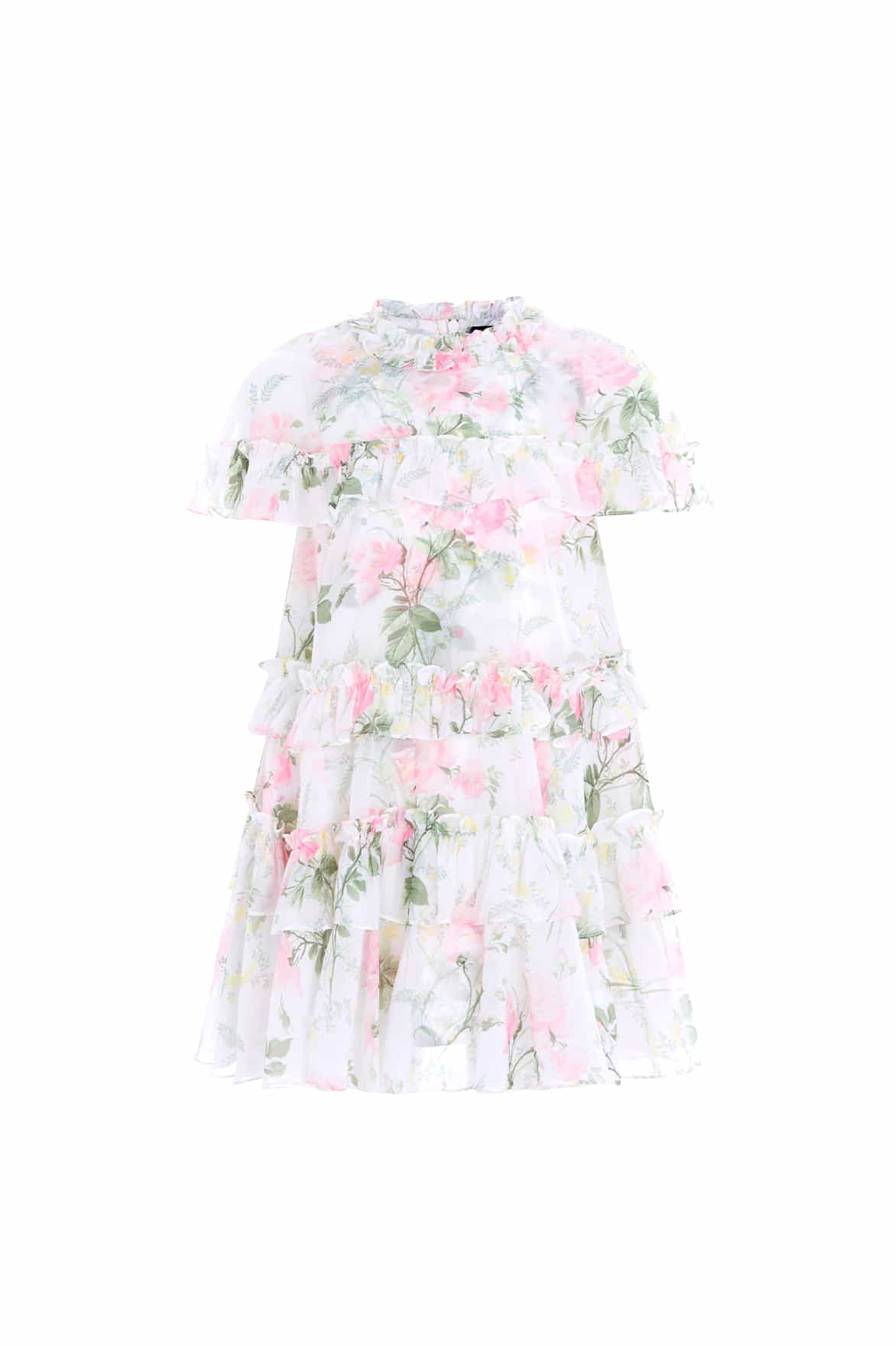 The Rose Chiffon Tiered Cape Kids Dress in Moonshine/Pink. This dress features an antique-inspired print of large rose blooms and trailing florals, taken from early 1900s hand-painted artwork. The playful cape is adorned with frills, while Needle & Thread frills decorate the neckline. With a loose-fit silhouette and frothy chiffon frills on the tiered skirt, it’s perfect for twirling in comfort.
