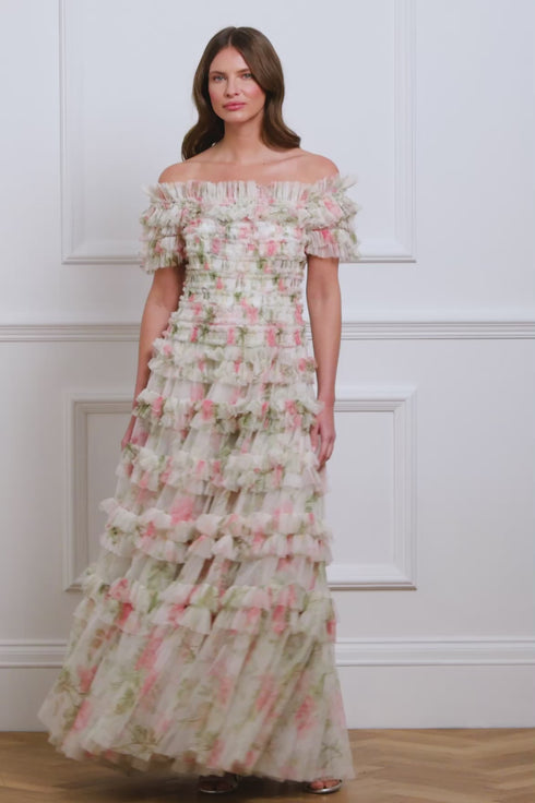 The Rose Lisette Off-Shoulder Gown in Moonshine/Pink features a romantic print inspired by antique hand-painted artwork with large rose blooms and trailing florals. This Hollywood-inspired gown has an elegant off-the-shoulder design, with double-stitched tulle frills graduating towards the hem. The voluminous skirt, made of layers of net and tulle, finishes with a sweeping hemline, creating a beautiful silhouette. Perfect for any special occasion.