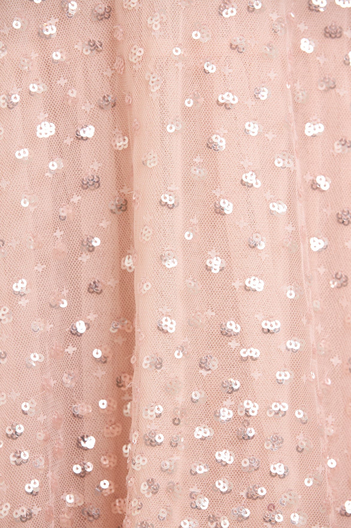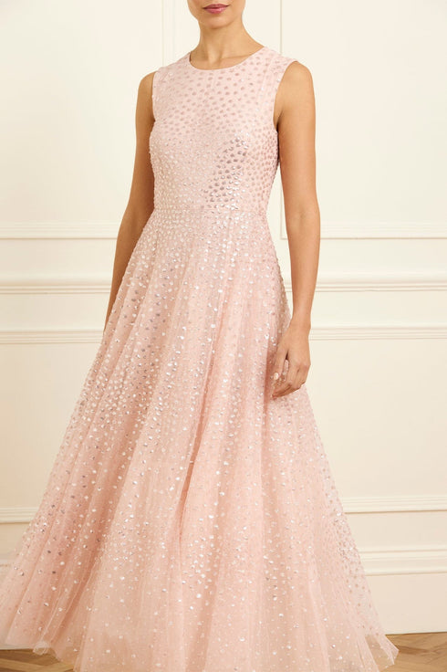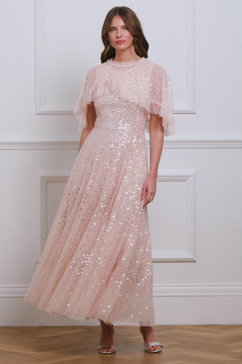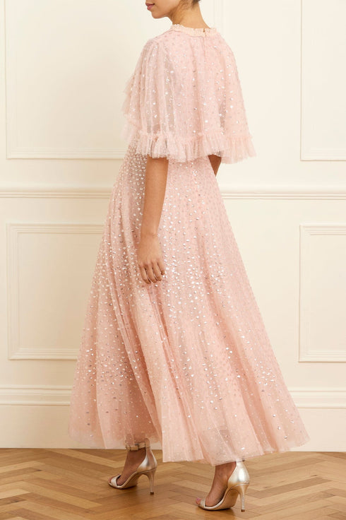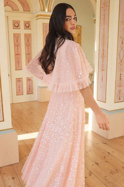 The Scatter Dot Short Cape Ankle Gown in Petal Pink. This embellished gown is decorated with exquisite shimmering dot motifs, undulating in wave formations for a captivating glittering effect. This beautiful gown features a short cape for romantic detailing and a statement look. The flattering square neckline is trimmed with signature Needle & Thread tulle frills. The skirt is made up of generous layers of net and tulle with a sweeping hemline. This magical piece is perfect for an upcoming special occasion and beyond.