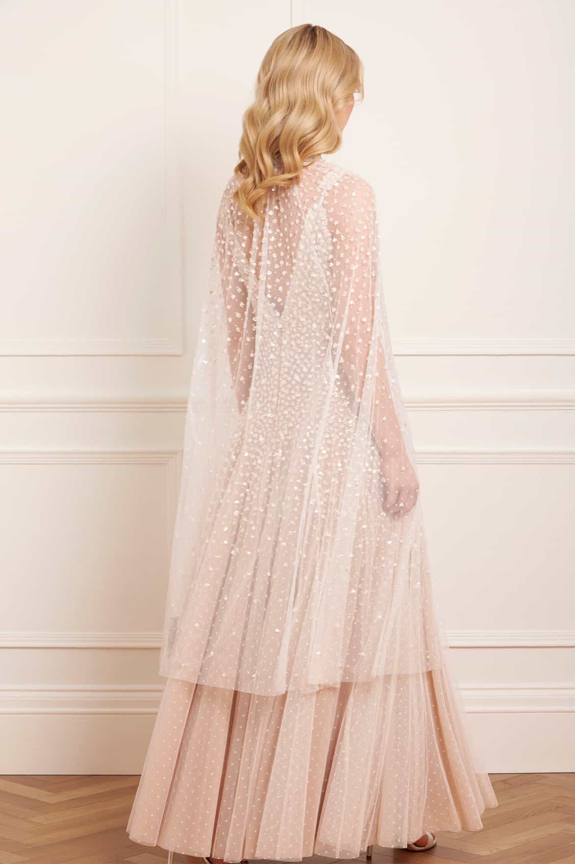 The Sequin Cascade Midaxi Open Cape in Cream. This elegant tulle cape is adorned with shimmering sequin dot motifs that gently scatter toward the hem, creating a soft, luminous effect. Each sequin features a special high-shine foil coating, adding an extra layer of brilliance and depth. Finished with a signature Needle & Thread frill at the neckline and a refined silver metal hook-and-eye fastening, this cape is a timeless accessory designed to elevate any look with grace and sophistication.