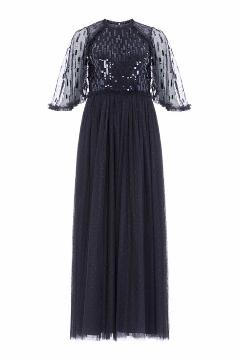 The Sequin Dash Bodice Ankle Gown in Graphite. The bodice of this ankle length gown is adorned with statement, square sequins in a staggered linear layout creating a shimmering effect. Developed with a loose silhouette for an effortless, floaty feel featuring voluminous sleeves for a romantic look. The skirt is crafted with layers of net tulle creating movement as you walk. The perfect gown for an upcoming special occasion.