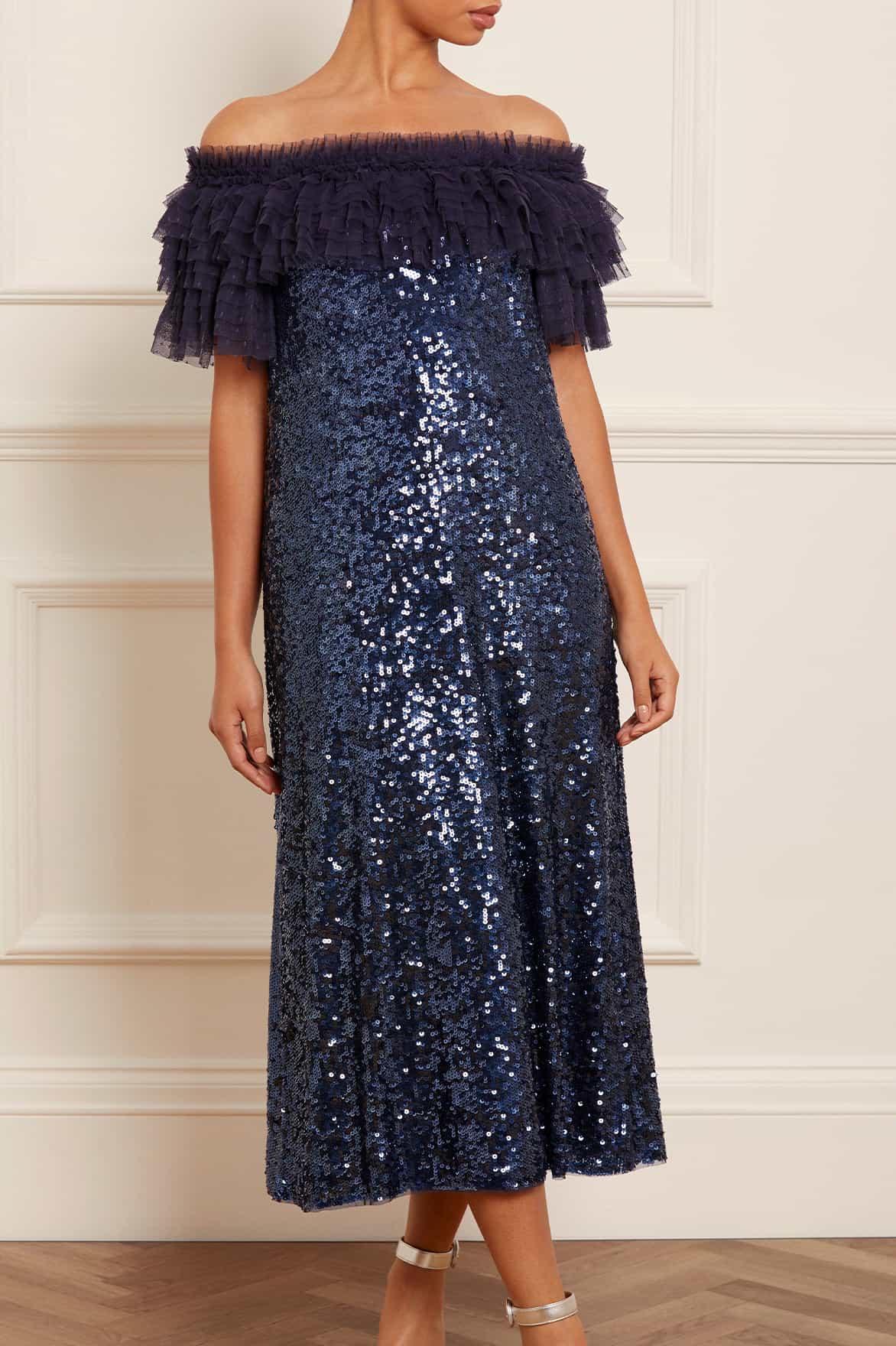 The Stephanie Ballerina Dress in Navy. A brand new party style for the season ahead. Beautifully crafted with a statement ruffle off-the-shoulder design, developed from layers of tulle and net to create this playful look. The neckline and sleeves are fully elasticated along the top edge for comfort. Decorated with rich, shimmering sequins to create an enchanting, glistening effect. Expect all eyes on you in this magical, fun style.