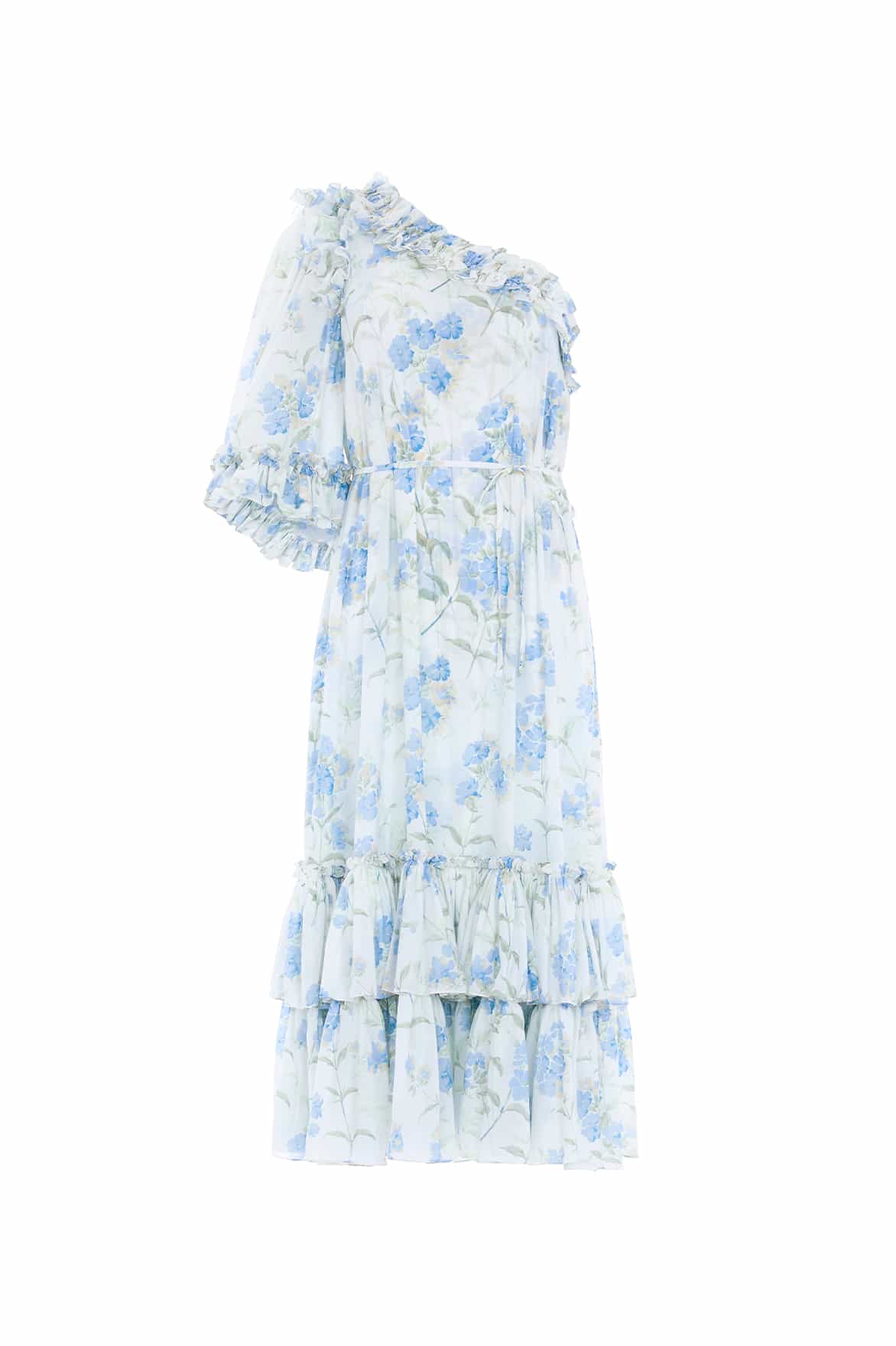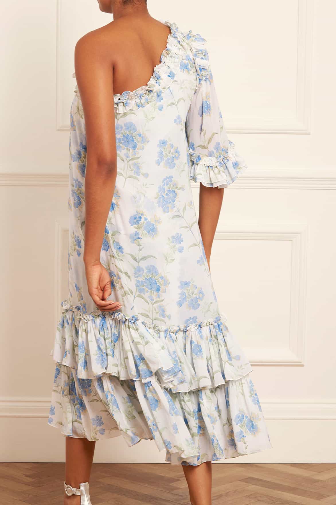 The Summer Posy Chiffon One-Shoulder Ballerina Dress in Moonshine. The print of this dress is taken from a 1930’s hand-painted wallpaper design. The artwork features a series of powder blue posies scattered in a soft formation. Developed with a one-shoulder design and generous, voluminous sleeves for a statement look. Designed with soft chiffon fabric with a loose-fit body for a relaxed silhouette. This dress includes a delicate fabric belt for versatile styling.