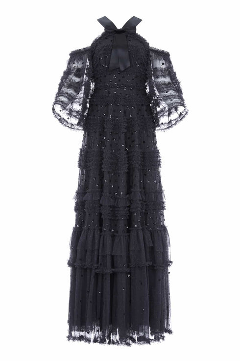 The Vivian Off Shoulder Gown in Graphite / Black. A signature Needle & Thread style statement. Beautifully printed with sequin polka dot motifs scattered throughout, creating an enchanting shimmer. Adorned with specially sourced sequins to create a sparkling effect throughout. This romantic style features tulle frills in perfectly positioned rows, creating a soft, frothy texture. Developed with generous ruffled sleeves, cut-out shoulders and a satin bow at the neck for a contemporary look. A stylish piece you'll wear time and time again.